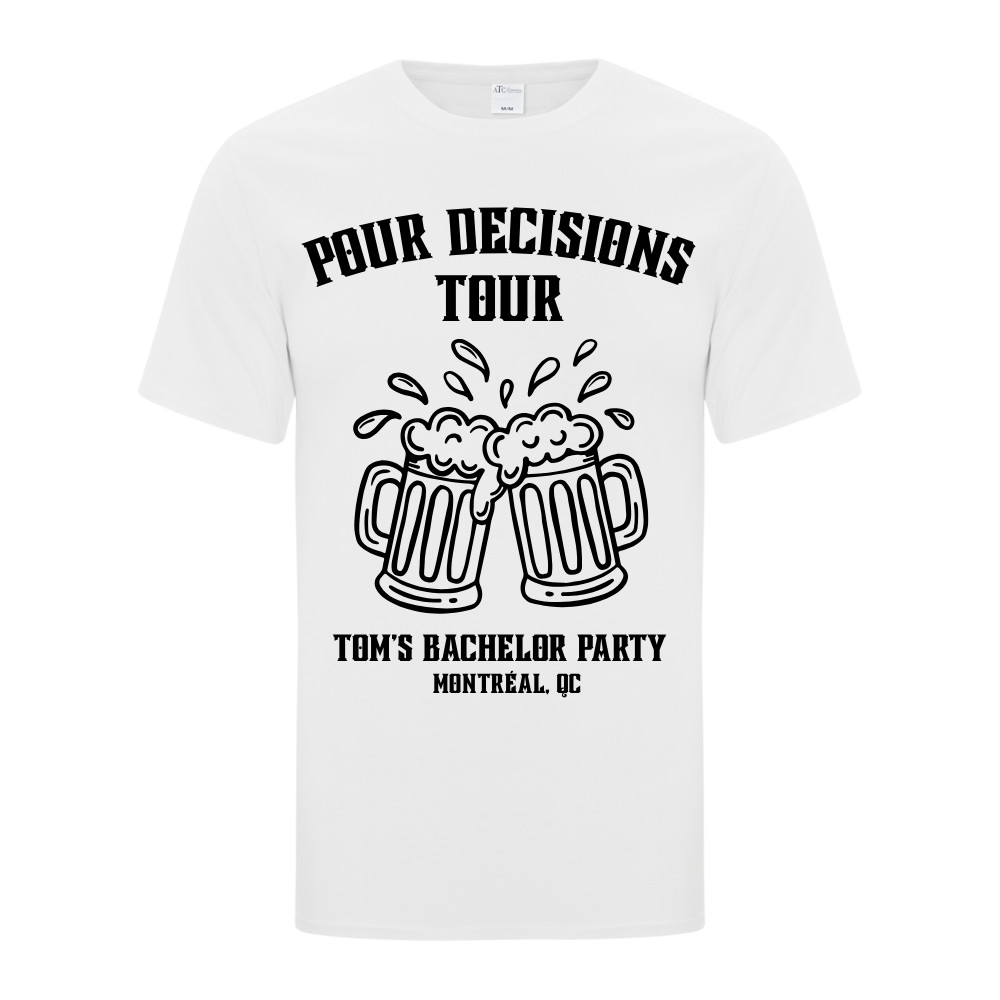 Raise a glass to bad ideas and great memories with this “Pour Decisions Tour” bachelor party t-shirt. Designed for unforgettable nights and legendary stories, this tee features clinking beer mugs and bold tour-style lettering, making it the perfect uniform for a bachelor party crew ready to celebrate.