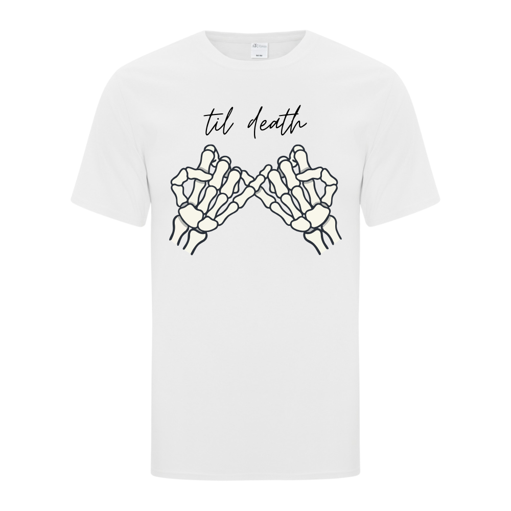 Celebrate forever with a little edge in this minimalist yet meaningful “‘Til Death” wedding t-shirt. Featuring illustrated skeleton hands linked together beneath elegant script text, this design symbolizes eternal love with a modern, slightly spooky twist.